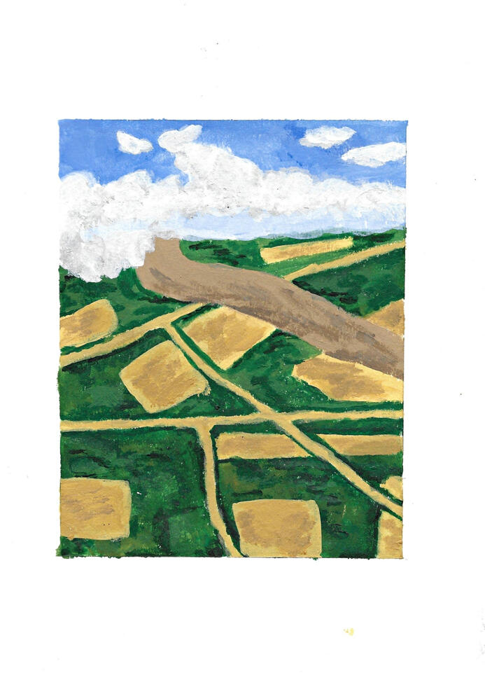 All three parts of the trilogy are inspired by photos I've personally taken. The original picture was photographed from the plane as I was leaving Cambodia after my month stay. I wanted to capture the rice fields and green plains of my motherland, emphasizing on the darken river that runs in between.