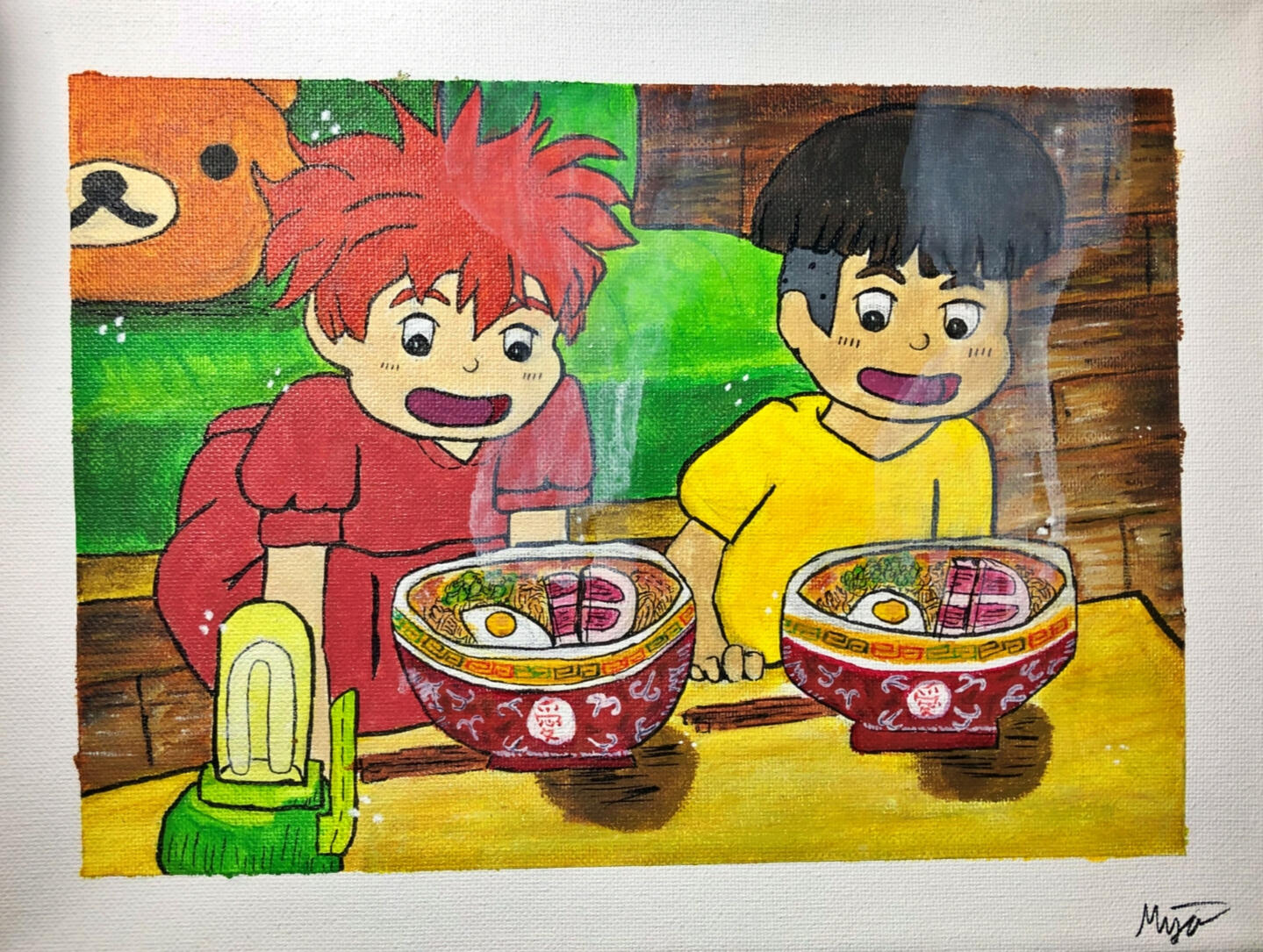 DIMENSIONS: 10" x 14"Requested and gifted to a friend. Inspired by the 2008 film created by Japanese director Hayao Miyazaki, Ponyo. I personalized the original screencap by adding Rilakkuma and changing the bowls. I continued to sketch the characters in my style.