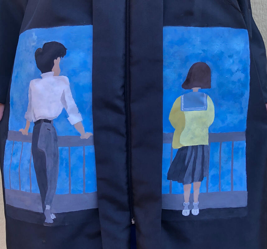 DIMENSIONS: 14 1/2" x 22"Inspired by the 1995 film created by Japanese director, Hayao Miyazaki, Whisper of the Heart. Due to not having a graduation ceremony, I painted one of my favorite films on my gown. I wanted this piece to embody my hopes and dreams for the future but still be simplistic.